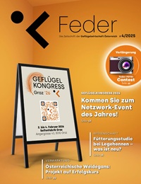 Die FEDER ist das Informationsmedium der Geflügelwirtschaft Österreich (GWÖ). Es erscheint vierteljährlich und wird an alle Mitglieder sowie öffentliche Einrichtungen und Kooperationspartner versendet. Partner der österreichischen Geflügelwirtschaft erhalten mit der FEDER laufend Information über die gemeinsame Arbeit und die Fortschritte im Interesse der gesamten Wertschöpfungskette in den Sparten Eier und Geflügel.